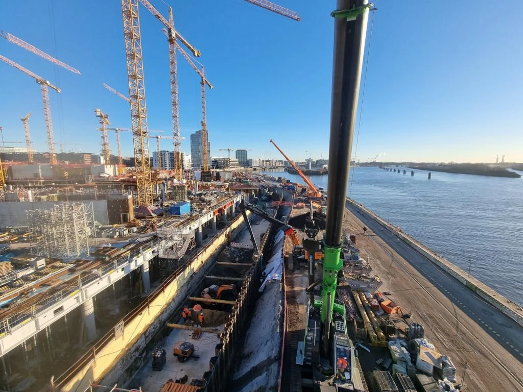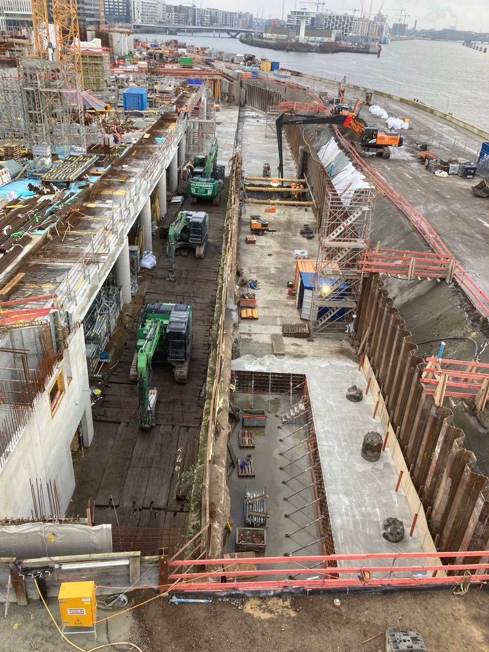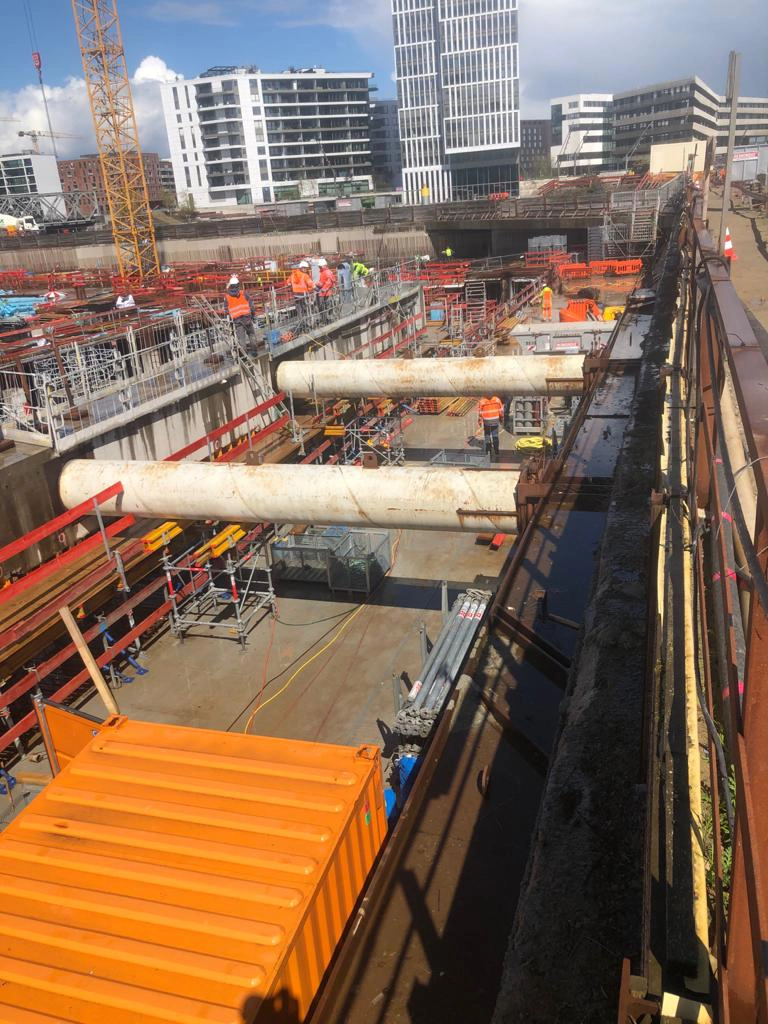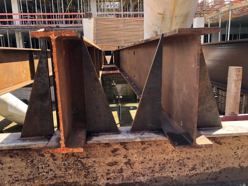 Vom Bauherrn, der Unibail-Rodamco-Westfield ÜSQ Development GmbH, haben wir den Auftrag für die Herstellung der „Rucksackbaugrube“ für das Warftgeschoss erhalten. Bevor hier die Arbeiten beginnen, unterstützen wir mit Stahlbau- und Schweißarbeiten für den Rückbau- und die Schalungsarbeiten.