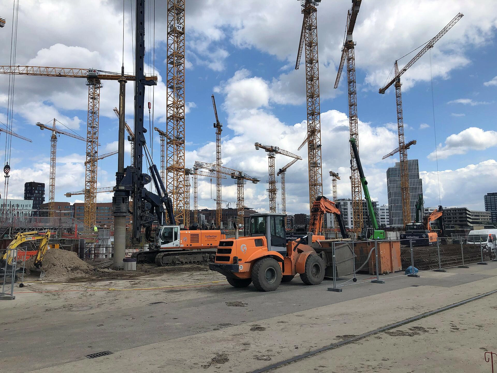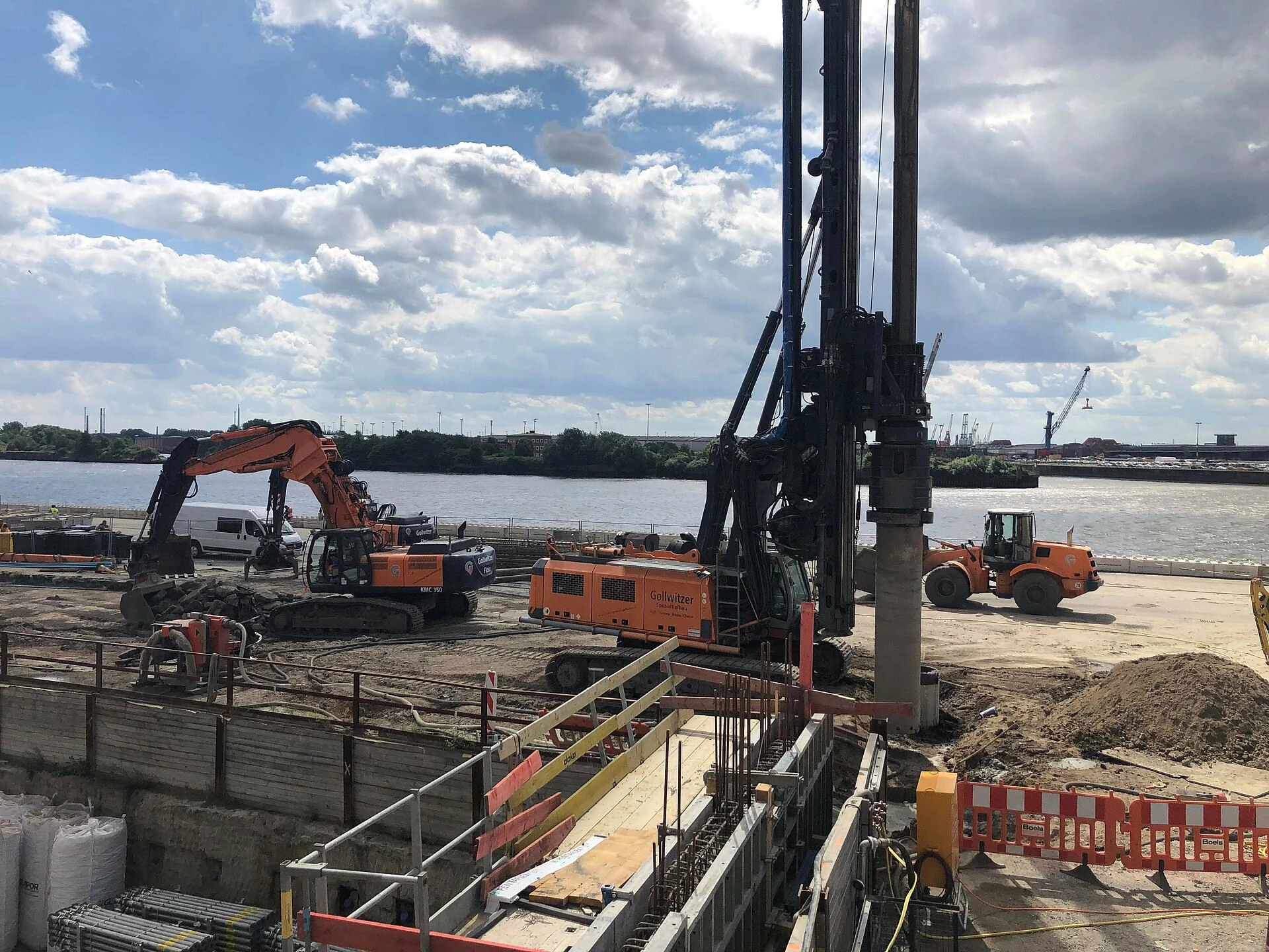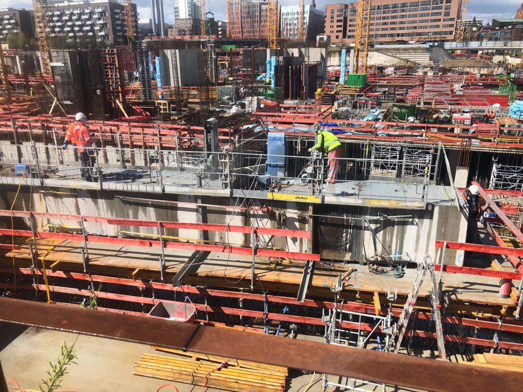Vom Bauherrn, der Unibail-Rodamco-Westfield ÜSQ Development GmbH, haben wir den Auftrag für die Herstellung der „Rucksackbaugrube“ für das Warftgeschoss erhalten. Bevor hier die Arbeiten beginnen, unterstützen wir mit Stahlbau- und Schweißarbeiten für den Rückbau- und die Schalungsarbeiten.
