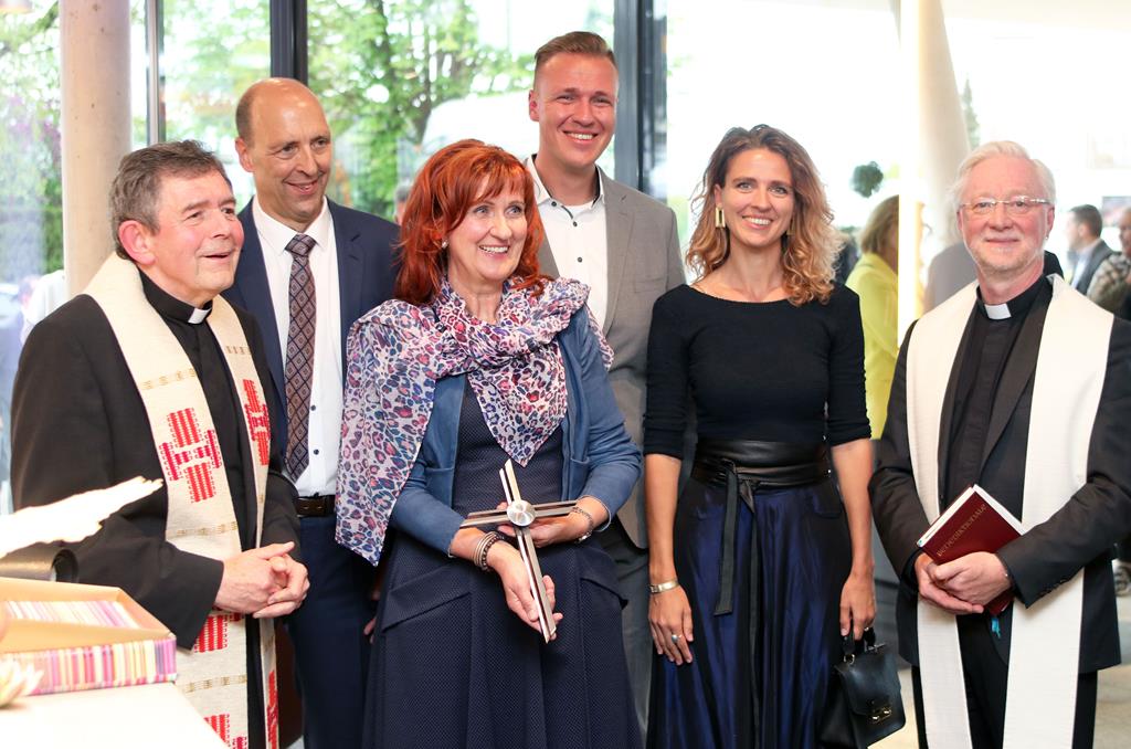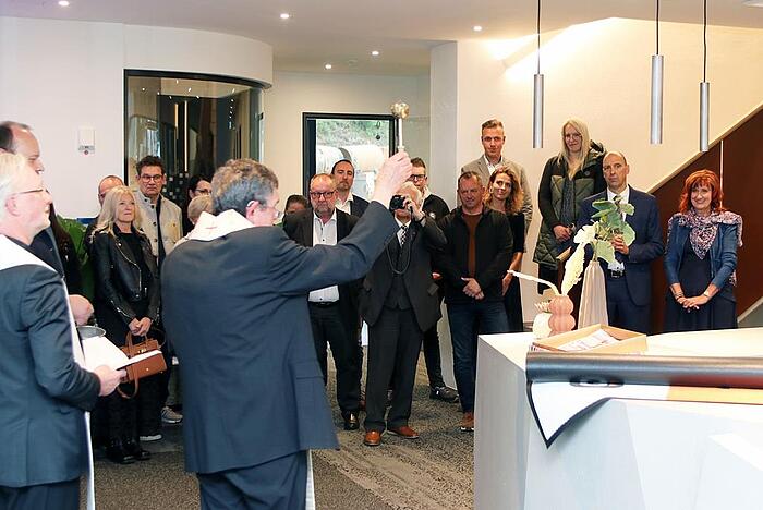 Andrea Gollwitzer gab, bevor die kirchliche Segnung des neuen Bürogebäudes folgte, einen kurzen Rückblick über die Beweggründe, dieses zu bauen und das frühere Elternhaus der Familie abzureißen: „Vor zehn Jahren haben wir uns nach dem immer größer gewordenen Platzbedarf mit Bürocontainern auf der ehemaligen Terrasse beholfen.